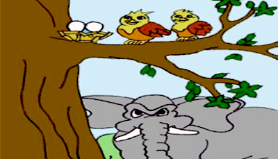 ایک دفعہ کا ذکر ہے کسی صحرا میں چڑیوں کا ایک خاندان رہتا تھا۔ انھوں نے گھاس پھونس میں انڈے دیے تھے جن سے بچے نکل آئے تھے۔ ایک ہاتھی کا بھی اسی صحرا میں بسیرا تھا۔ ایک دن ہاتھی اپنی پیاس بجھانے کے لیے دریا کی طرف جا رہا تھا کہ گھاس سے گزرتے ہوئے وہ چڑیوں کے چند بچوں کو کچل کر آگے نکل گیا۔ جب چڑیوں کومعلوم ہوا تو انہوں نے  اس سانحے پر اپنے اپنے انداز میں تبصرہ کرنا شروع کیا۔